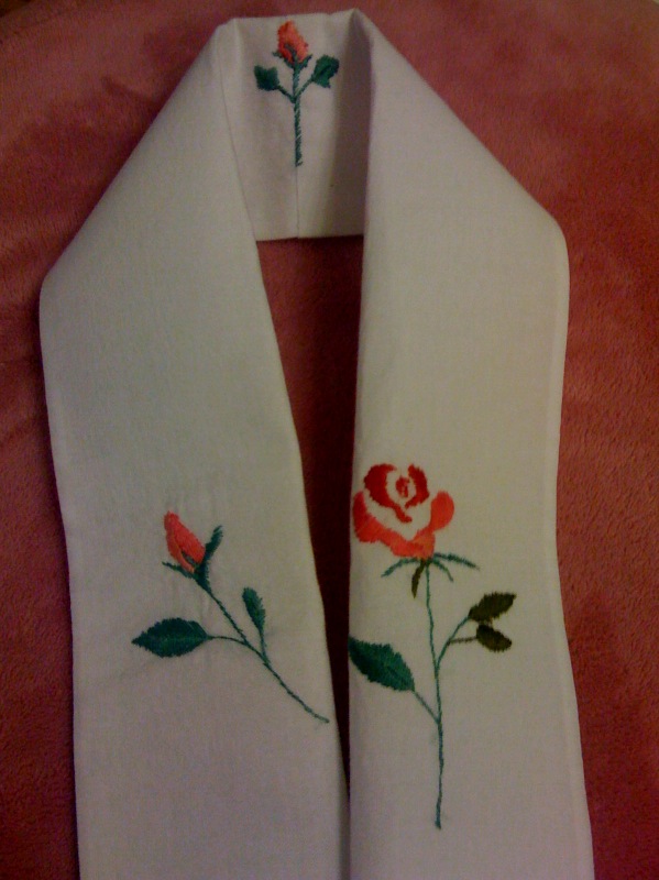 まず、半襟の生地に水で消えるちゃこぺんで簡単な下絵を描き、初心者用の刺繍の本を参考にして刺していき。。